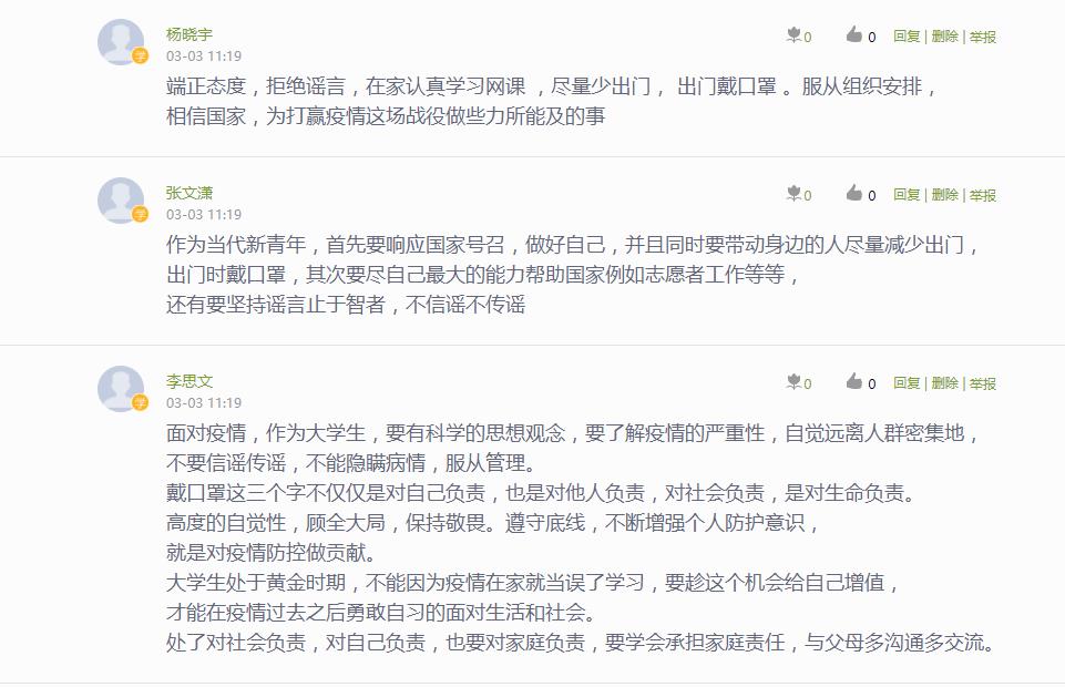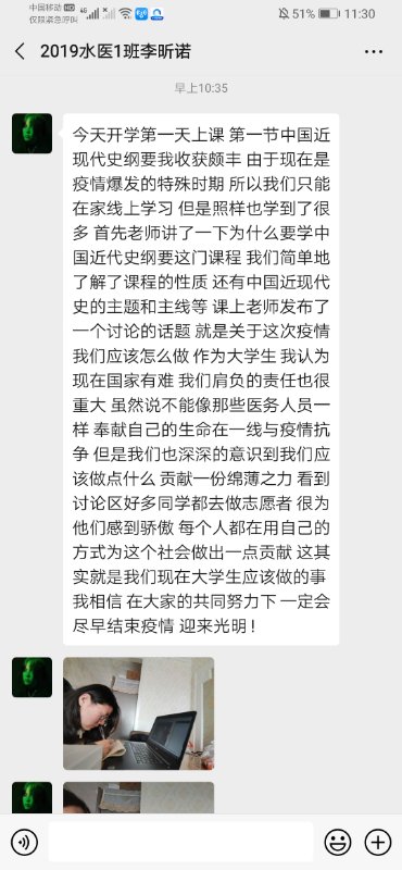 新学期,李老师开启的第一堂《纲要》课,就别开生面。他运用腾讯会议和学习通平台,为2019级水生医学和水族专业的100位同学,进行在线授课。第一次以“主播”的形式跟学生视频见面,无论对于李老师还是对于学生来说,都很新鲜。教学中,李老师一开始就以同学们非常关注的疫情为切入点,用历史的思维将近代以来尤其新中国成立以来,我们党带领中华民族抗击疫情的历史与当前中国和世界抗击疫情的现实充分结合起来,既回顾了过去的历史,又关注了眼前的现实,用历史照进现实。既全面立体地阐释了党领导各族人民抗击疫情的举措和实效,又引用各方人士抗击疫情的感人视频和世卫组织专家的高度评价,来展示中国的速度、效率和责任。进一步引导学生思考:为什么中国能够迅速使疫情得到有效控制,这场阻击战的背后包含着哪些成功因素,通过这次疫情防控有哪些启示。同学们在线上讨论热烈。其中水生医学专业的李想同学在学习通中写道“新冠疫情刚开始,是一件让人恐慌的事,但是在中国共产党的领导下积极应对,如今已有了基本控制,我在这期间加入了网上救援队,虽然无法在抗击一线,但也尽自己的微薄之力去帮助那些网上求助的患者得到救助。”水族专业的易江楠同学留言说,“面对疫情,我参加了社区支援服务活动。通过这次疫情,我感到国家的团结力无比强大。”最后,这场讨论,在李老师的积极引导和启发下,使学生逐渐认识到中国在这次疫情面前所展现出的高速度和高效率,得益于党的集中统一领导的政治优势、全国一盘棋的组织优势、一方有难八方支援的制度优势、团结一心众志成城的凝聚力以及乐于奉献、舍小家为大家的集体主义优势,概而言之就是中国特色社会主义的制度优势,这更加坚定了大学生的制度自信和道路自信,增强了他们对国家的认同感和爱国主义热情。这堂有历史厚度和温度的《纲要》课,是深入贯彻习近平总书记关于打赢疫情防控阻击战的重要指示精神,更好落实教育部、教育厅、学校“停课不停学、停课不停教”的现实要求,是探索如何把《纲要》课程教学的思想性和现实性结合起来的重要体现。