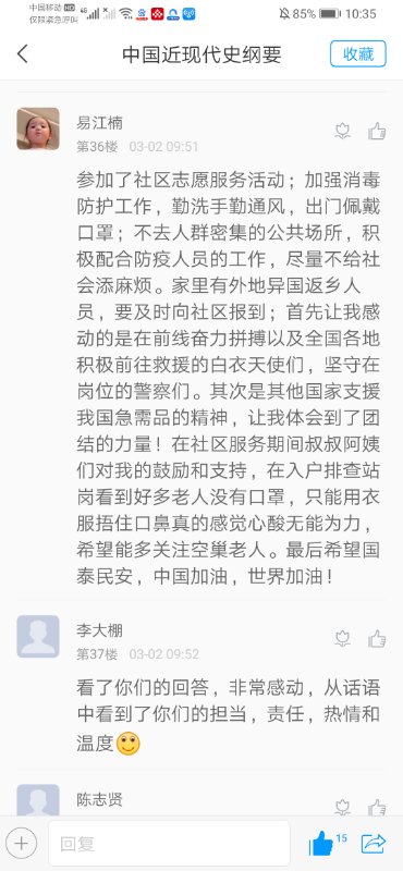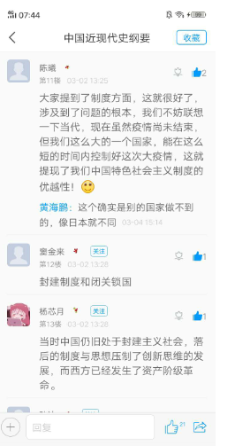 一席话引发了学生的共鸣,也将学生带入中国近现代史学习的情景,正式进入第一课《导论》章节的视频学习。新课学习接近尾声后,陈曦老师以“没有一次疫情不会结束,没有一个春天不会到来,中华民族永远不倒!”作为结束语与学生共勉,使学生的心灵再次受到触动,增强了民族自尊心、自信心和自豪感,也更加坚定坚持共产党领导和坚持中国特色社会主义制度的信心,将在学生心中燃烧起来的爱国热情推向了高潮,赢得了学生网上的一片赞许。