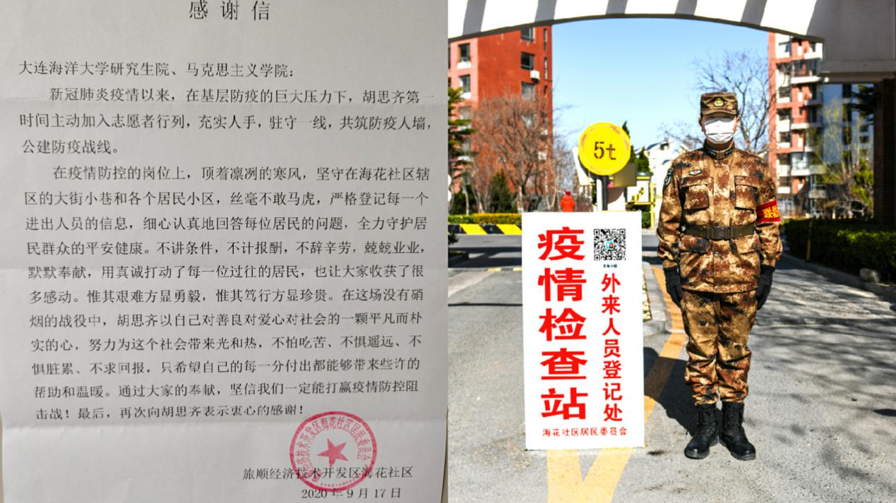天下兴亡,匹夫有责。新冠肺炎疫情当前,“防护、防控”是每个人义不容辞的责任。感谢胡思齐同学践行了无悔的誓言:“小我融入大我,青春献给祖国”。疫情尚未结束,我们仍需“内控反弹,外防输入”。希望每一位同学照顾好自己身体的同时,积极配合学校的疫情防控工作。在“大海大”的每一天都健健康康,平平安安。