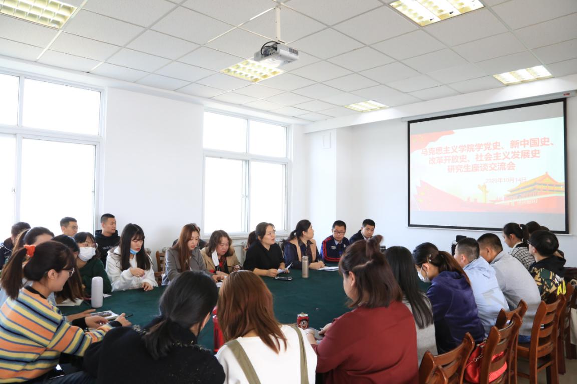 10月14日,永利集团304am官方入口在图书馆马克思主义理论阅览室召开“学党史、新中国史、改革开放史、社会主义发展史”研究生座谈交流会。本次会议由党总支副书记兼副院长吴卫卫主持,教师代表马兆俐、李大棚、王云翠及全体研究生参加了本次会议。