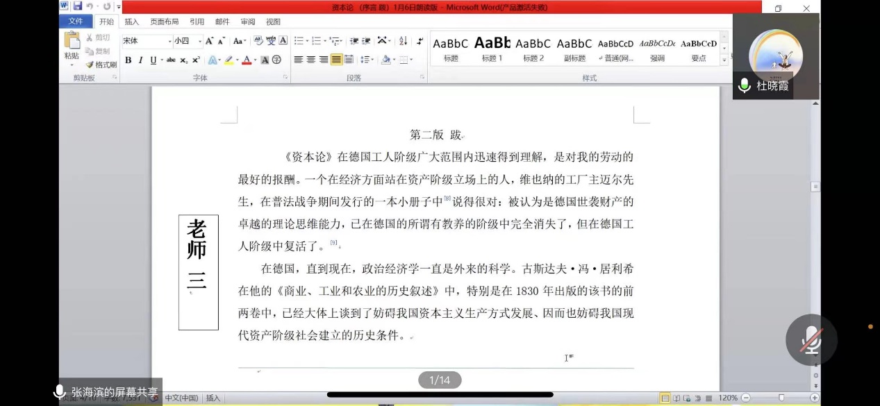 师生接力朗读经典书目《资本论》第一版《序言》和第二版《跋》,并深入交流研讨。老师们解答了同学们在阅读过程中存在的疑问,并以当前疫情形势为例,用抗疫“新教材”诠释了研读经典的现实意义。张海滨老师提出“大处着眼,小处着手。”即关注句子细节,仔细品阅字里行间流露的深刻内涵,理解章节篇幅中饱含的真理色彩。大家深入交流研讨,营造了停课不停学的良好氛围。