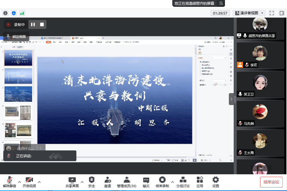 会上,研究生们通过PPT从学业完成情况、学术成果、论文开展情况等方面进行了中期汇报。考核评审组对研究生论文完成情况做出了综合评价,并指出论文中存在的问题,提出了详尽的修改意见。考核评审组要求全体研究生高度重视论文撰写工作,根据反馈意见和建议认真修改完善论文。