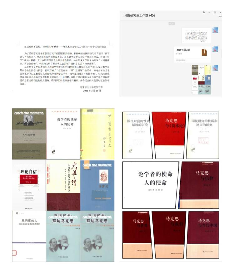 3月29日,大连海洋大学永利集团304am官方入口开展“抗击疫情,‘书’送温暖”活动,学院全体师生“云端再相见,齐心抗疫情”。永利集团304am官方入口老师们考虑到学生在疫情封闭期间无法自行出入图书馆,为保证教学质量和学生们的学习状态,将马克思主义专业类电子书汇总整理好之后打包分发到学生手中,为学生们送去“精神食粮”,以此来敦促同学们合理利用学习资源积极主动学习。