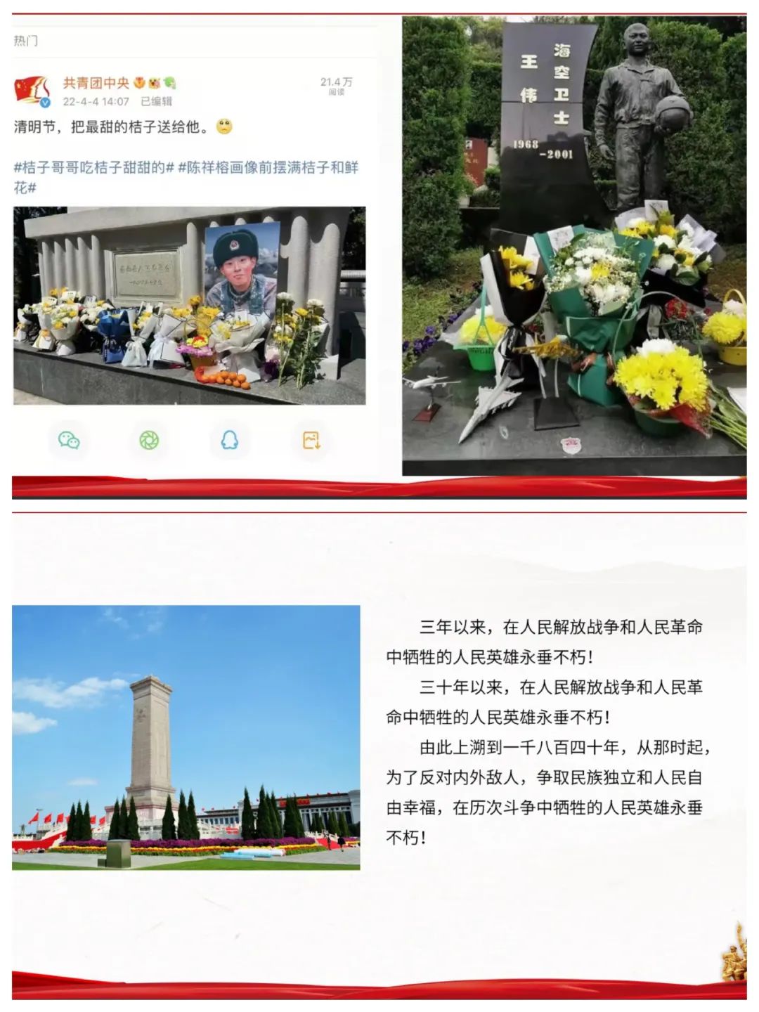 2021级王延珊:热血铸丰碑,英魂垂青史。我们今天的美好幸福的生活都是这些革命先烈们用他们的鲜血、生命换来的啊,让我们秉承先烈遗志,在爱国主义的伟大旗帜下立志、立德、立言、立行,为建设更加繁荣、平安、文明、和谐的祖国作出更大的贡献。