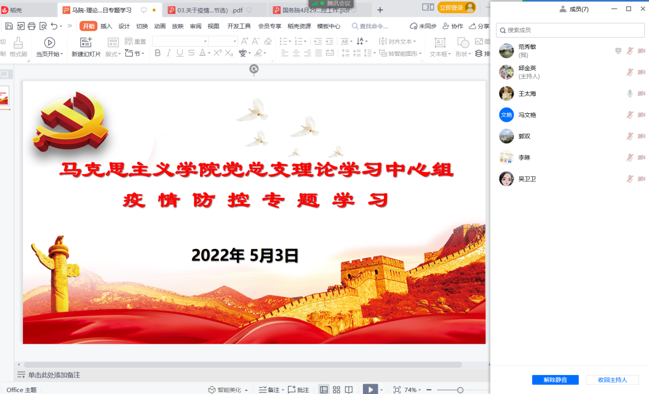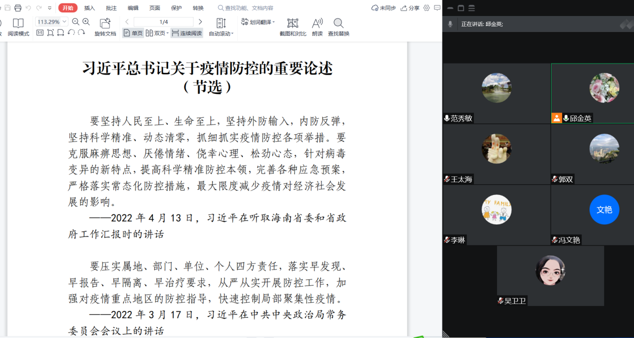 会上以总支委员领学的形式集中学习了“习近平总书记关于疫情防控的重要论述(节选)”以及“国务院 4 月 29 日新闻发布会相关会议精神:坚持“动态清零”做好疫情防控工作”。在研讨交流环节吴卫卫、冯文艳分别做了交流发言。