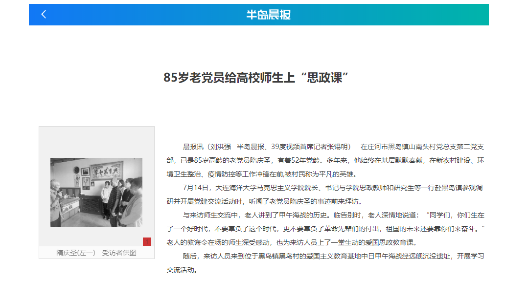 近日,大连半岛晨报A15版以“85岁老党员给高校师生上党课”为题,报道了永利官网永利集团304am官方入口师生赴庄河市黑岛镇开展的找寻红色记忆主题党日活动