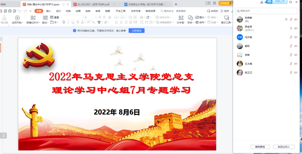 8月6日,永利集团304am官方入口党总支以腾讯会议形式召开了本年度理论学习中心组7月专题学习会议,学院党总支理论学习中心组成员参加会议。会议由学院党总支书记邱金英主持。