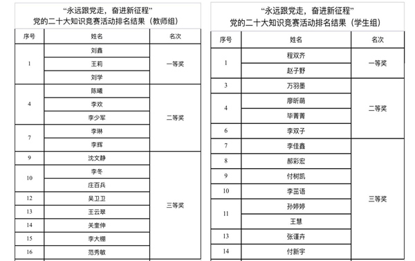 本次比赛围绕党的二十大报告的重要内容编写考题,采用填空题的形式通过在线平台开展,参赛者们准备充分、积极作答,营造了良好的学习和竞赛氛围。经过激烈角逐,师生两个组别分别评选出一等奖2名,二等奖4名,三等奖8名。
